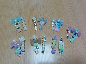 土台のクリップに選んだビーズシールやリボンを飾り付けました。