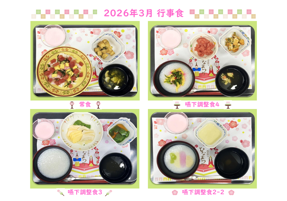3月の行事食はひなまつりをイメージしたかわいらしいお食事をご用意しました。まぐろのお刺身は入院中になかなか味わうことが出来ないと好評をいただきました。今後とも患者さんに喜んでいただけるお食事の提供に努めてまいります。