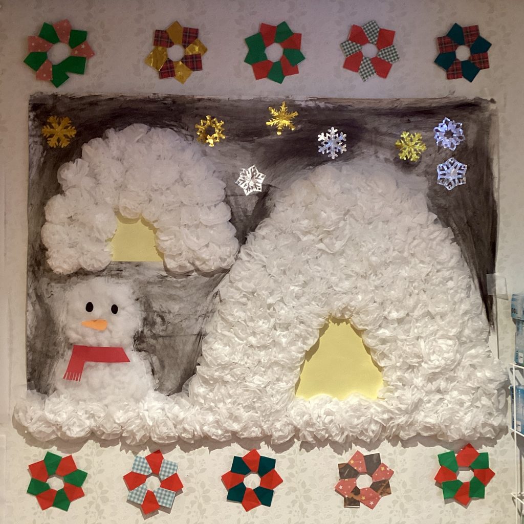お花紙でお花を作る作業は利用者の皆さまが出来る工程が多いので、たくさんお花を作って雪に見立て、かまくらを表現してみました☺️