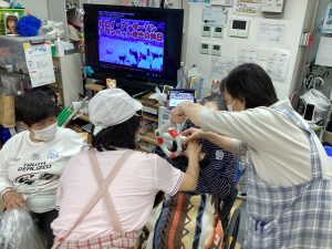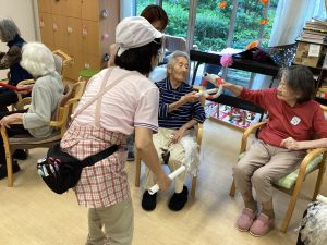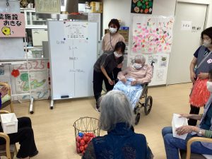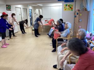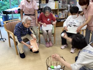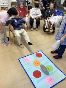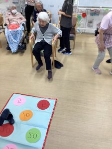 まずは玉入れ。皆さん、目の前のカゴをめがけて、投げられました。