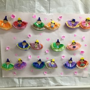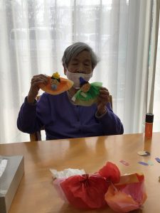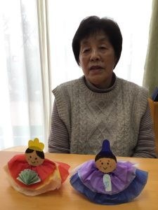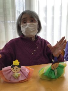 お花紙で着物を作り、皆さまそれぞれが思い描く表情を描いたひな人形が完成しました。にっこり笑顔や優しいまなざしなど、どれも個性豊かで、眺めていると心がほっこりします。ひな祭りらしい華やかな時間となりました。