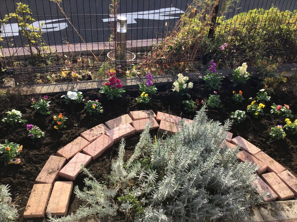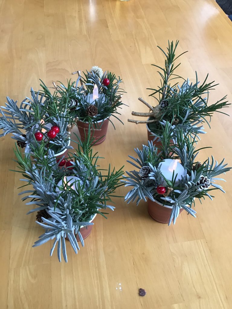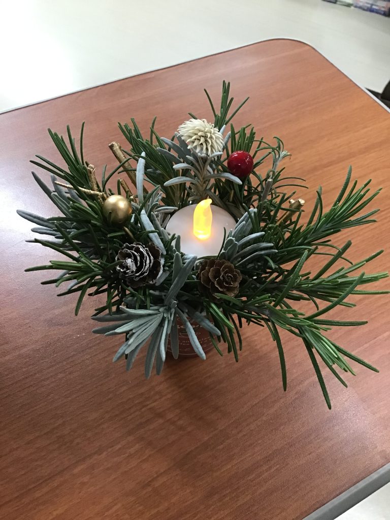 オアシスにローズマリーとラベンダーを交互にいけて、木の実などをボンドで付ける作業でした。