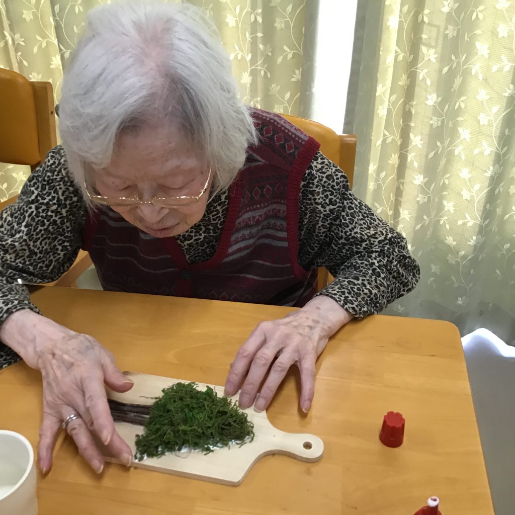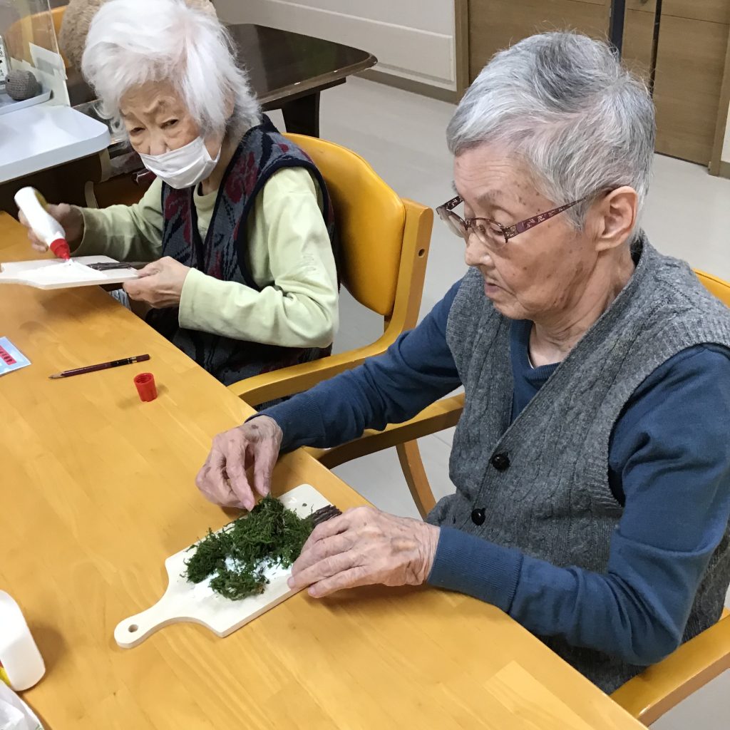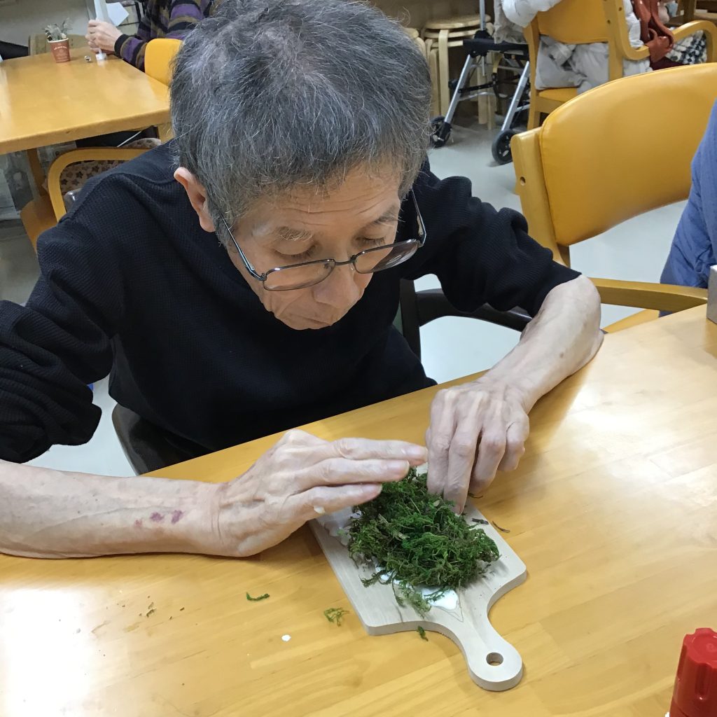 木の板を土台に、苔や松ぼっくり、木の実をひとつひとつを選びながら、『これもかわいい、ここにしよう』と自然と会話が生まれ、