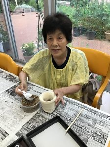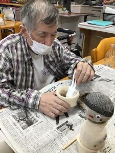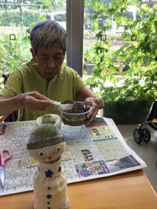 指先を細かく使って、小さな芝の種と土を混ぜ合わせて人形の頭を作りました。